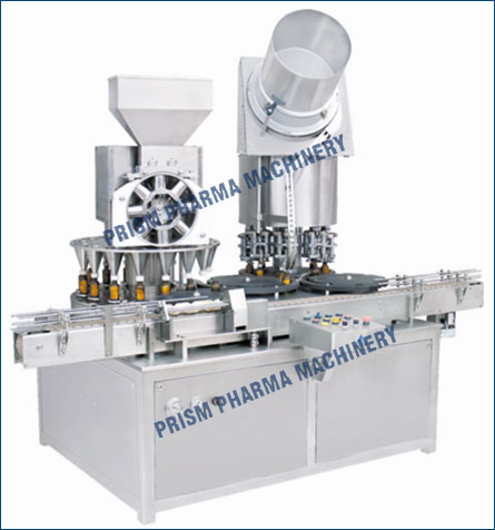 Automatic monoblock type dry syrup powder filling & sealing Machine is works on vacuum principle with rotary star wheel & piston assembly & Rotary funnel head. It is used to fills dry syrup powder in bottle in pharmaceuticals, foods, and dairy and agro chemicals industries.