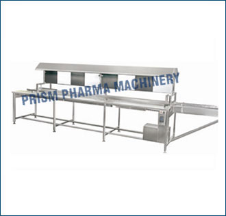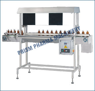 The central conveyor belt brings the bottle from the capping machine conveyor. These bottles are automatically bifurcated on the two adjoining conveyor belts & further on the side tables for operators sitting on either side of the table. The operators in turn pick up the bottles & visually inspect the bottles in the alternate white & black background to check for any partials in the liquid filled, sealed & breakage of bottle. After inspection, good bottles are placed in the central track, which is transfer for labeling.